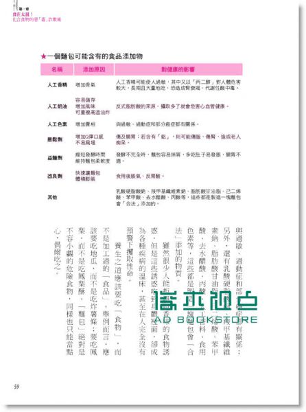 ◎<重大食品安全事件簿>烘焙香精一點靈!胖達人史上最大宗麵包事件 *食品級香精不等於天然香料 *如何辨別是否添加香精 *一個麵包有十數種「合法」添加物 *市售麵包聰明挑安全吃 ◆注意包裝成份標示 ◆善眼睛和鼻子 ◆相信時間的考驗 ◆餡料越單純越安全 *什麼才是「正港」的天然發酵、健康麵包 ◆細聞氣味之別 ◆食用後胃是否發脹反酸 ◆麵包體是否充分發酵 ◆掂掂斤兩是否紮實 *無所不能的香料化學公司 *味蕾沒有判斷力,但可以慣性訓練 辨別手作天然麵包五大步驟 天然麵包V.S人工好吃麵包比一比 天然香精VS化學人工香精有何不同 歐式、日式、台式麵包特色差異 <走進好店挑對麵包。跟著專家一起防毒>