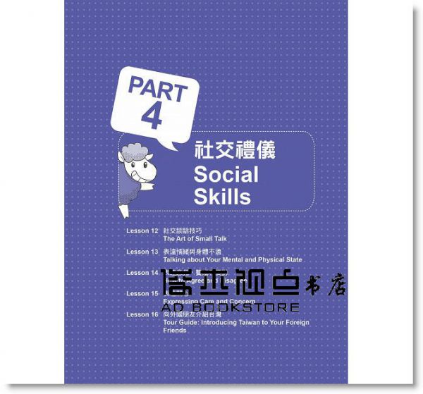 Part4 社交禮儀Social Skills Lesson12社交談話技巧The Art of Small TalkLesson13表達情緒與身體不適Talking about Your Mental and Physical StateLesson14表達意見,贊成和反對How to Agree and DisagreeLesson15表達關心Expressing Care and ConcernLesson16向外國朋友介紹台灣Tour Guide: Introducing Taiwan to Your Foreign Friends
