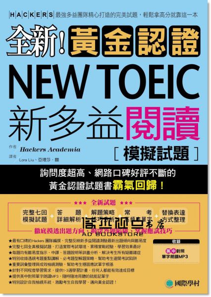 全新!黃金認證NEW TOEIC新多益閱讀模擬試題:詢問度最高的閱讀測驗最新題庫,輕鬆拿高分就靠這一本(雙書裝+1MP3)해커스 토익 실전 Reading作者: Hackers Academia 追蹤作者 新功能介紹譯者:Lora Liu,亞理莎.關出版社:國際學村 訂閱出版社新書快訊 新功能介紹出版日期:2016/05/20語言:繁體中文定價:799元