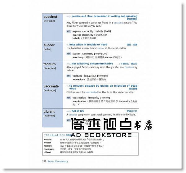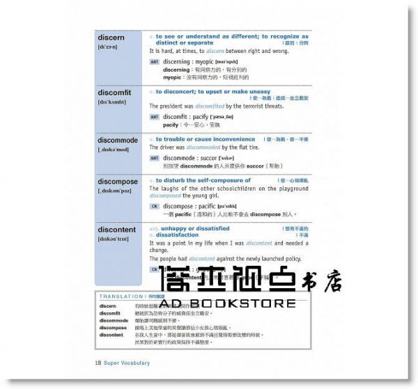 2. 本書收錄的字彙,整理自英檢高級、GRE、GMAT、SAT、TOEFL、公務員高考的高頻率出題字彙。所提供的例句都內容涵蓋生活、考試及工作,可以讓你的字彙更豐富、表達力更完整,且句中每個單字都是比較簡單的字彙,不會出現還有其他生字出現的情況。