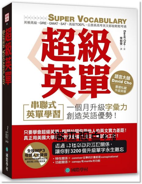 「好!我知道我要升級我的單字能力,那我來背字典好了。」雖然這種熱情很好,但其實這是一種很笨的方法。因為英文是一種不斷有創新字的語言,而且隨便一本字典都有6、7萬個字以上,所以不分青紅皂白地猛背只會讓英文學習的效益變差而已。要知道大考中心公布的是7000單字,但實際生活只要用到3000單字就可以流暢的跟外國人基本溝通。所以硬吞字典只會背到一堆你根本用不到,也不常看到、聽到的單字,因此我們要升級我們的「單字力」,其實是要聰明的去背那些「高階、但常用」的單字。這方面,剛好就是語言學博士 David Cho 老師的拿手絕活!David Cho 老師運用他分析多益的能力,將英文原文書、報導、雜誌以及各種高階英語測驗全部都拿來分析研究,將所有「不浪費你學習的時間、精力,真正讓你提升單字實力」的《超級英單》全部集中在這本書中。