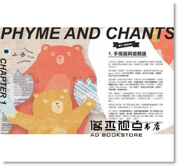 美國孩子耳熟能詳的念謠,其中不乏台灣孩子也能朗朗上口、有中文版的,如Old McDonald Had a Farm(王老先生有塊地)、London Bridge Is Falling Down(倫敦鐵橋垮下來)等,好玩又好記!