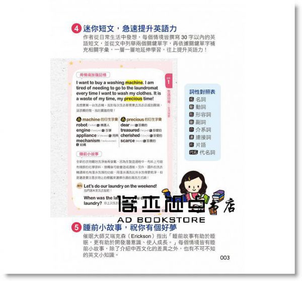 8. 睡前小故事,祝你有個好夢 催眠大師艾瑞克森(Erickson)指出「睡前故事有助於睡眠,更有助於開發潛意識、使人成長。」每個情境皆有睡前小故事,除了介紹中西文化的差異之外,也有不可不知的英文小知識。 作者介紹