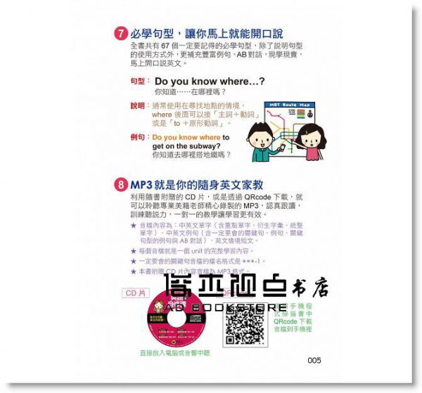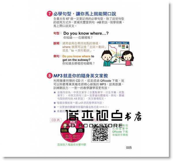 7. MP3就是你的隨身英文家教 利用隨書附贈的CD片,或是透過QRcode下載,就可以聆聽專業美籍老師精心錄製的MP3,認真跟讀,訓練聽說力,一對一的教學讓學習更有效。