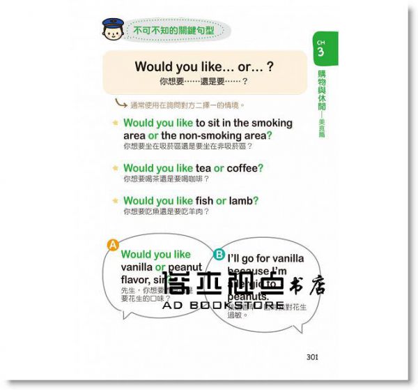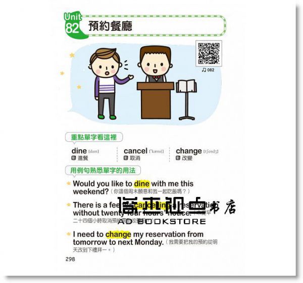 ◎ 美食篇 Unit 080 【喝咖啡】在咖啡廳當文青 Unit 081 【吃早午餐】悠閒享受早午餐 Unit 082 【訂位】預約餐廳 Unit 083 【吃歐式料理】用餐禮儀不可少 Unit 084 【義式料理】我最愛義式料理了 Unit 085 【下午茶】甜點是另一個胃 Unit 086 【吃速食】吃速食迅速解決一餐