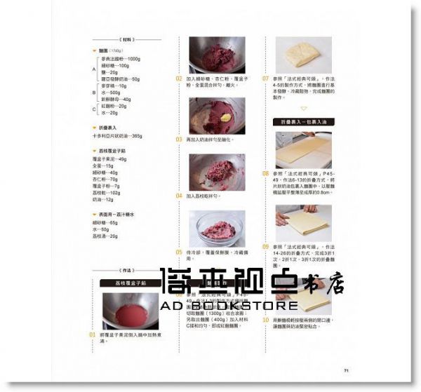 如果沒有壓麵機,如何手擀出裹油麵團的漂亮層次與厚度? 裹油麵團的包裹次數要多少,才能做出絕佳口感? 如何擀製片狀奶油,自製大理石巧克力片? 折疊整型時,為什麼一定要控制溫度與鬆弛? 這些專業技巧,就是影響折疊麵團風味的秘密。