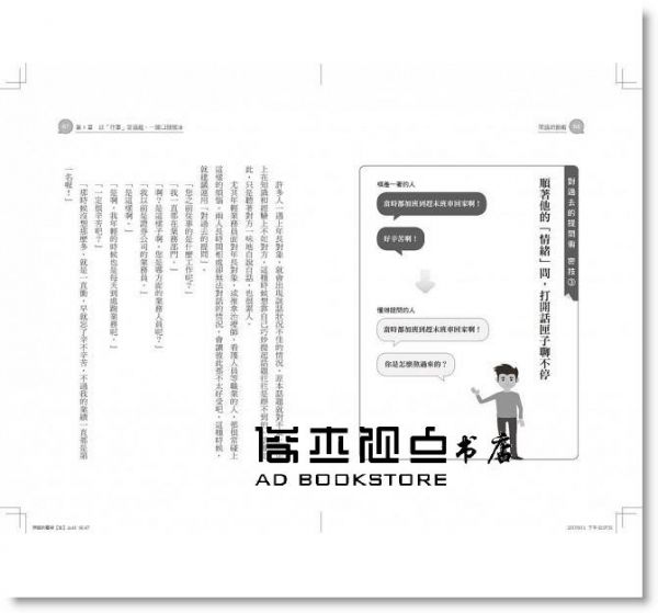 ① 依「時空順序」發問,別人最好回答 ② 聚焦「對方興趣」,話題持續不尷尬 ③ 順著「情緒」問話,打開話匣子聊不停 ④ 「思考時間」要給足,緊迫盯人氣氛易僵化 ⑤ 「過去式+開放式」問話,跟誰都能輕鬆聊 ⑥ 「先讚美再責備」,部屬不反彈又好溝通 ⑦ 抓準「話裡關鍵字」,提升好感最快速