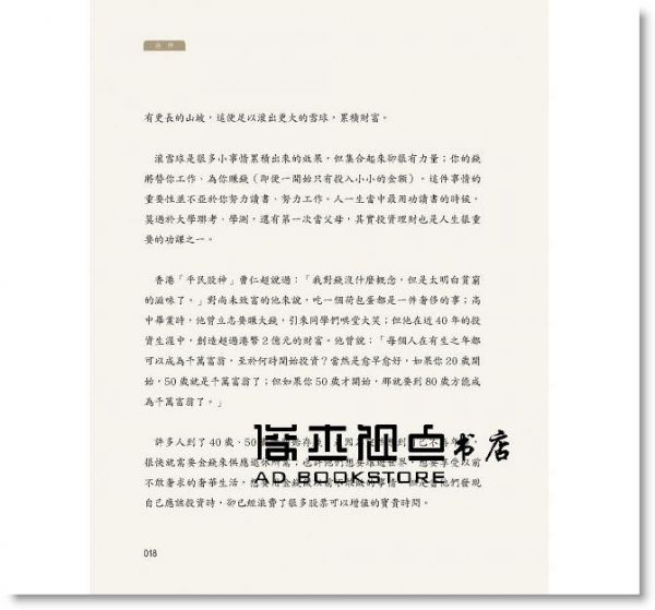 ◎及早投資滾雪球 讓你的錢為你工作 但是為什麼絕大多數人做不到?因為我們沒有被教育過,所以沒有正確的知識,沒有堅定的信念和耐心。股神華倫巴菲特(Warren Edward Buffett)說過:「人生就像雪球,重要的是要找到濕的雪,和一道長長的山坡。(Life is like a snowball. The important thing is finding wet snow and a really long hill.)」。人生如此,投資亦是如此,重點就是「濕的雪」和「長長的山坡」。