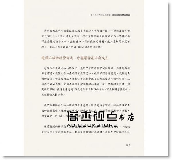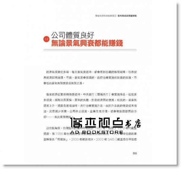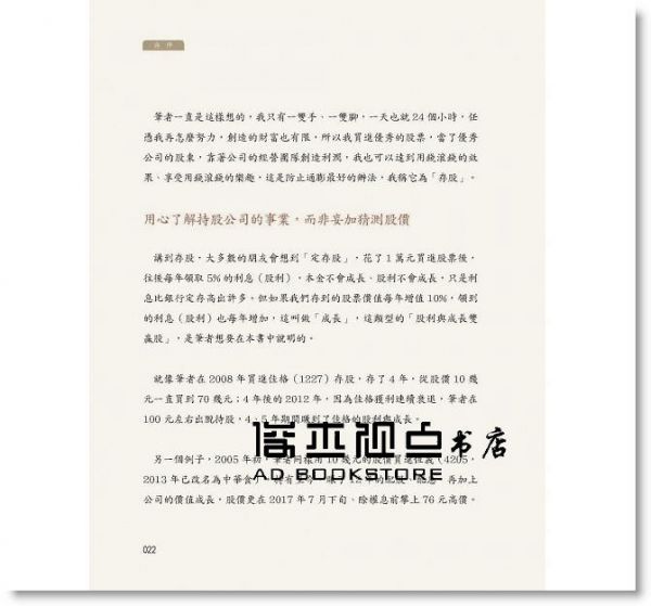 王志郁推薦序:理財真的沒有那麼難 羅仲良推薦序:穩中求勝的投資策略 朱紀中推薦序:讓財富跟著好股票一起成長 自序:存「股利與成長雙贏股」 提高資產抗通膨能力 Chapter1釐清投資觀念 站上正確的起跑點 1-1 用投資理財抵抗通膨 替未來創造更多消費力 1-2 公司體質良好 無論景氣興衰都能賺錢 1-3 堅守能力圈 只投資最有勝算的股票 1-4 看清自己的優劣勢 抱持堅定信念就能成功 Chapter2 觀察企業優勢 篩出高品質雙贏股 2-1 兼具定存和成長特質 雙贏股複利威力驚人 2-2 股神賺錢的祕密──找到具護城河的壟斷事業 2-3 護城河1》專利與特許權 提高競爭者進入門檻 2-4 護城河2》高轉換成本 培養使用習慣鞏固客源 2-5 護城河3》規模優勢 產業龍頭大者恆大 2-6 瞄準簡單、可預測產業 花少少心力就能穩穩賺 2-7 觀察歷史獲利紀錄 避開波動起伏劇烈標的 2-8 護城河出現潰堤3徵兆 趕緊出脫持股為宜 Chapter3 解讀財務報表 確實評估個股價值 3-1 資產負債表》檢視財務 判斷公司體質強弱 3-2 綜合損益表》解析獲利結構 掌握營運績效 3-3 現金流量表》觀察現金流向 衡量虧損倒閉風險 3-4 財務比率》評估數據趨勢 作為個股買賣依據 3-5 本益比》預估回本年數 判斷當前股價是否合理 Chapter4 診斷產業前景 挑對體質強健標的 4-1 釐清6種股票屬性 才能安心長抱 4-2 發揮觀察力 從日常生活挖好股 4-3 6種存股族關注產業 受景氣影響愈少愈好 4-4 存股組合貴精不貴多 專注10檔為佳 4-5 新創產業難長保競爭優勢 不宜當作存股標的 4-6 留意轉投資經營績效 小心「多角化」變「多慘化」 4-7 貿然搶進高殖利率股 恐落入2陷阱 4-8 買進低殖利率的卓越公司 強化資產成長力道 4-9 靠現金增資發股利 當心公司創造現金能力不足 Chapter5堅持投資紀律 輸少贏多放大獲利 5-1 嚴格遵守2原則 只挑最有把握時機才出手 5-2 觀察財報數字 獲利連續衰退就出脫 5-3 遇到利空大跌 3要點評估加碼時機 5-4 大盤站上萬點 公司有成長性仍值得買進 5-5 掌握零股出價技巧 小錢也能買高價成長股 5-6 想等除權息後撿便宜 恐錯過公司價值成長時機 Chapter6深度剖析持股 打造不敗投資組合 6-1 山林水》汙染防治業務穩定 不受景氣波動影響 6-2 統一集團》食品業龍頭 可視為穩健定存股 6-3 日友》醫療廢棄物處理龍頭 未來成長性就看中國市場 6-4 可寧衛》固化、掩埋無敵手 為高殖利率定存股 6-5 德麥》烘焙原料龍頭 積極進軍餐飲業 6-6 一零四》求職市場領導品牌 短期內難有抗衡者 6-7 中保》保全業龍頭地位穩固 搶攻長照、物聯網商機 後記:巴菲特教我的事 收回 序
