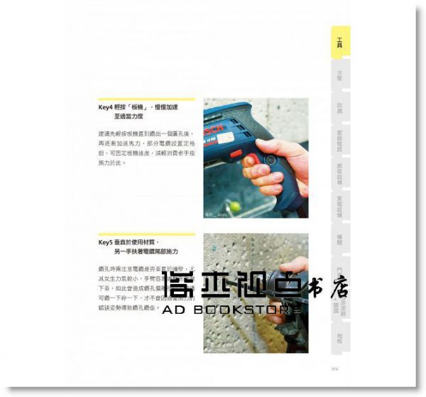 ??修繕工具介紹、常見方法運用 列舉居家最易碰到的問題,並搭配建議的方法與工具,根據自己的需求與狀況,快速了解情況並能立即解決。