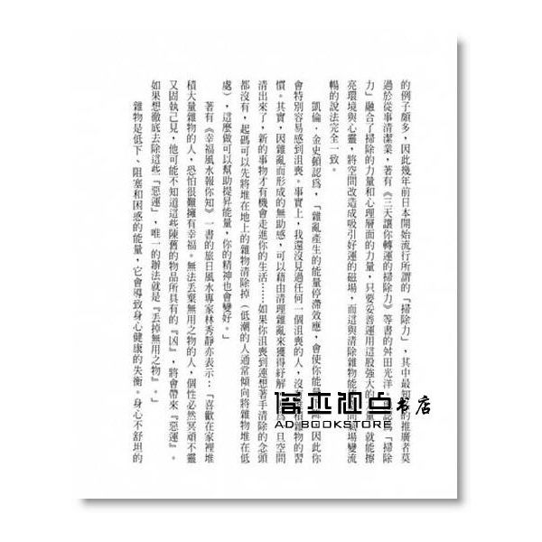 當然不是所有堆積物品、收藏物品的人都是一種「病態」。台灣社會在自我整理與面對自我選擇的訓練是缺乏的,我們的社會常是「人情」與「人際」取向,以理智來處理或管理人際互動中非常繁多的物品交換、或贈與,本就屬於不容易之事。丟不掉的人情,害怕虧欠他人的心意,一直是社會文化對我們的塑造。只要能有自覺自己長期以來的慣性模式,與成長歷程對自己的影響,進而願意改造自己,提升自己,相信重整生命空間,是指日可待之事。而本書便提供一個實用、詳盡,同時簡潔有力的示範。讀者不妨將此書視為一位清理教練,透過教練教導的步驟與程序,一步一步地回顧自我,重整內外在空間。