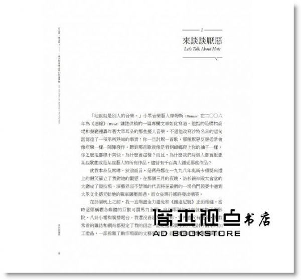 但是,我們會如何討論「喜愛」,或者更精確說,我們會如何討論「厭惡」?藉著仔細檢視我們在音樂上的恐懼和厭惡,檢視我們認定的「壞品味」,可能會讓我們看出許多隱藏的真相,以及你所不認識的自己。