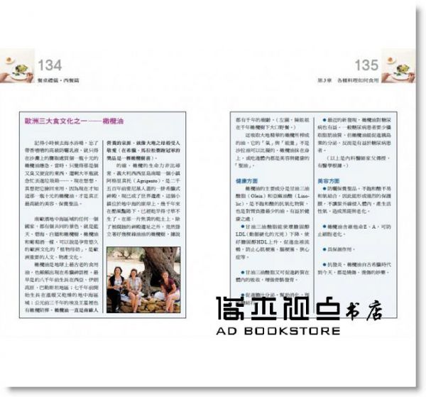 第3章 各種料理如何食用 一. 湯(英文Soup,法文Soupe) 二. 麵包(英文Bread,法文Pain) 三. 沙拉(英文Salad,法文Salade) 四. 牛排(英文Steak,法文Bifteck) 五. 帶頭骨的肉、小羊排、雞腿、丁骨牛排 六. 魚(英文Fish,法文Poisson) 七. 龍蝦(英文Lobster,法文Langouste) 八. 串烤(Brochettes) 九. 生牡蠣(英文Oyster)、法式蝸牛(法文Escargot) 十. 借助手指幫忙的食物 十一. 盤裡美麗的配飾、配菜可以吃嗎? 十二. 吃簡餐、小吃也有規矩哦! 義大利餐―― 歐洲的「中國菜」 歐洲三大食文化之一―― 橄欖油 義大利的橄欖油 十三. 義大利麵類(義文Pasta) 歐洲三大食文化之一―― 起司:「神的腳臭香」 起司和葡萄酒是絕配 十四. 蛋糕(法文Patisserie) 十五. 水果、冰淇淋 十六. 茶和咖啡的喝相,和吃相一樣重要 紅茶的知識 咖啡的知識 正統的英式下午茶