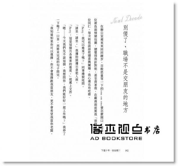 工作了一段時間後,清楚的理解到一件事:很多能力需要靠經驗的累積,而這是學校裡沒辦法教的事。所以工作的過程中常常在想,是否能有個貼身教練可以隨時授與我功力,有時更會突發奇想,是否真能有像武俠小說裡所演的一樣,能巧遇武俠高手,對我醍醐灌頂,甚至能將一身所學只憑藉內力傳送,就可以灌注到自己的身上,讓我一日千里、功力大增。很幸運的,我在Betty這一本《下個十年,你在哪?》上,看到這個可能,因為它不僅給你大智慧,字裡行間還充滿了各式執行技巧。