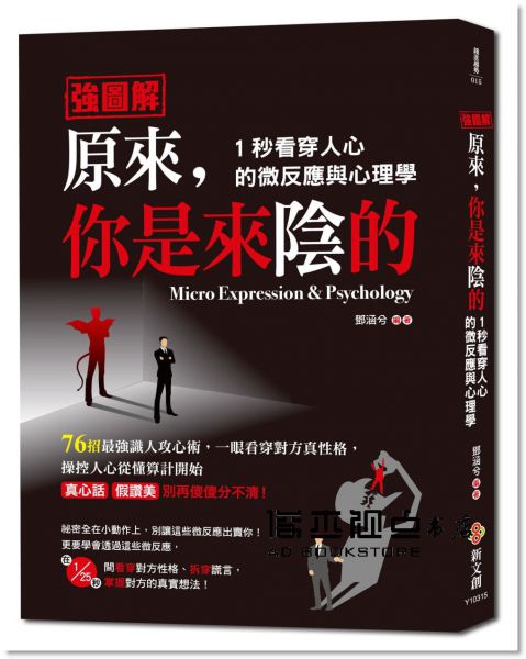 強圖解 原來,你是來陰的:1秒看穿人心的微反應與心理學,你必須在握手前就知道對方在想什麼,看穿對方性格、拆穿謊言詳細資料ISBN:9789579068048規格:平裝 / 240頁 / 14.8 x 20.8 x 1.5 cm / 普通級 / 單色印刷 / 初版出版地:台灣作者: 鄧涵兮 出版社:新文創文化 出版日期:2019/04/24語言:繁體中文定價:299元內容簡介你必須在握手前就知道對方在想什麼!76招最強識人攻心術,一眼看穿對方真性格,操控人心從懂算計開始眼睛反應真實情緒,手勢就是內心投影,讀懂他人的無聲語言和內心世界,才能投其所好,說對的話,做對的事,達成目標。真心話、假讚美,別再傻傻分不清!