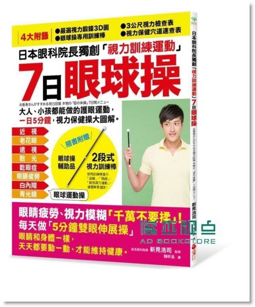 【獨家眼球保健4大附錄】 本書除全彩動作示範外,更特別收錄4大附錄贈品,眼球操專用兩段式訓練棒、嚴選3D圖、視力保健穴道速查表及3公尺視力檢查表,保健視力全面俱到。