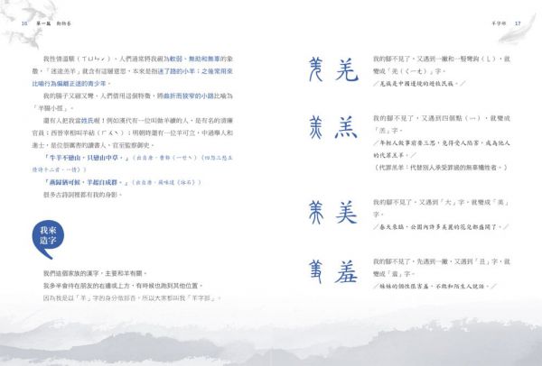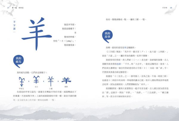 每一個部首由「我的祖先」、「我的故事」、「我來造字」三部分組成,從簡到繁,循序漸進介紹各個部首,透過妙趣橫生的文字說明,激發大朋友和小朋友們的奇特想像、思考方式,並能學習巧妙地跨越和銜接,舉一反三,衍伸出更多的單字和詞語。