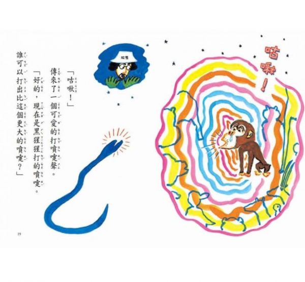 星期六的動物園,一大早就好像要下雨了。 為了參加「打噴嚏大賽」, 動物園裡的動物竟然故意淋雨,讓自己感冒, 小象甚至一直在噴水池前淋浴。 保育員阿原好擔心…… 半夜的廣場上聚集了好多動物,阿原躲在一旁偷看, 由蛇當裁判,大家一一上場,鸚鵡與黃鶯竟然唱起歌來、貓熊卻表演滾圈圈,獅子也不是打噴嚏,而是放臭得要命的屁…… 到底這次打噴嚏大賽的冠軍會是誰呢? 結果一定會讓你意想不到!