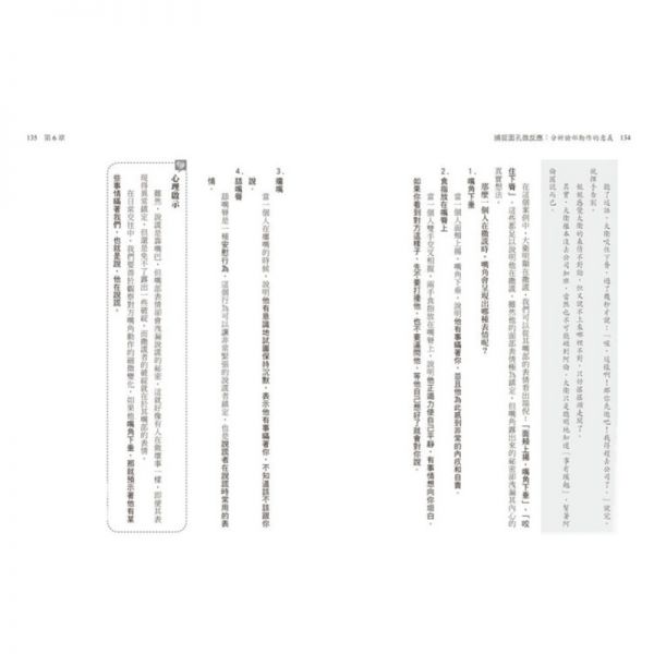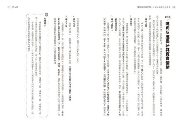 目錄前言 讀懂他人內心,抓住瞬間的真實情緒 第一章 任何人都不能偽裝的微反應:你一定要懂的微反應知識第一節 揭開微反應的神祕面紗 第二節 微反應是人的第一反應第三節 微反應的狀態分析 第四節 常見微反應表達的真實意義第五節 不會撒謊的微反應 第六節 別因微反應而讓自己露出破綻 第二章 掌握微反應的運用技巧:輕鬆捕捉細微動作第一節 透過情緒捕捉微反應第二節 微反應所隱藏的潛意識第三節 從邊緣系統反應分析微反應第四節 捕捉細微反應判斷言語真實性第五節 情緒會潛移默化地影響微反應第六節 透過微反應看出對方的真實心理第七節 微反應有時會背離真實心理 第三章 解碼常見的微反應:快速明瞭對方的真實情意第一節 領地反應-不可侵犯 第二節 仰視反應-服從與合作第三節 安慰反應-釋放壓力 第四節 逃離反應-厭惡或恐懼第五節 距離反應-親疏有間第六節 凍結反應-瞬間靜止狀態第七節 勝敗反應-榮辱皆驚 第四章 觀察表情微反應:分析他人內心喜惡第一節 一閃即逝的表情微反應 第二節 喜悅微表情,展現其內心的愉悅第三節 憤怒微表情,展現其內心的怒火第四節 驚訝微表情,感受其內心的不可思議第五節 恐懼微表情,揭露其不安的內心第六節 厭惡微表情,揭祕對方正在煎熬的內心 第七節 悲傷微表情,體會對方內心的悲情 第五章 觀察眉目微反應:分析眉宇間的真意第一節 常見眼部表情的微反應 第二節 常見眉毛動作的微反應 第三節 瞳孔的不同反應顯示其內心情緒 第四節 對望,眼神變化的微反應第五節 頻繁眨眼的微反應 第六節 眼球轉動的微反應 第七節 雙眼斜視表露的意義 第六章 捕捉面孔微反應:分析臉部動作的意義第一節 面部表情是可以偽裝的 第二節 嘴巴小動作的微反應 第三節 嘴角反應揭祕其真實情緒第四節 嘴巴緊閉和張開的微反應第五節 撒謊時嘴巴的反應第六節 頭部動作顯露其內心真實想法第七節 鼻子會出賣你內心的祕密第八節 面孔變化是內心真實的反映 第七章 捕捉情緒的微反應:分析不同情感的真意第一節 愉悅反應-眉開眼笑 第二節 喜悅反應-嘴角上揚 第三節 憤怒反應-目光如炬 第四節 驚訝反應-眼神疑惑 第五節 不安反應-面部僵硬第六節 悲傷反應-默默流淚 第八章 捕捉手部微反應:手勢變化演繹內心起伏第一節 常見的手部微反應 第二節 雙手相握的微反應 第三節 你看不見的手勢微反應 第四節 說話時手勢的細微變化 第五節 緊握雙手洩漏其內心的不安情緒 第六節 手勢微反應暴露出真實心理 第七節 塔尖式手勢顯示其內心的高傲 第九章 捕捉撒謊微反應:各種小動作讓謊言難掩第一節 撒謊時,對方在做什麼?第二節 分析撒謊的假笑動作 第三節 笑容越複雜,越容易洩漏祕密第四節 從微反應分析對方是否說謊第五節 虛假表情難以掩飾真實情緒 第六節 手勢微反應中隱藏的謊言第七節 辨識語氣-話語中的暗示 第十章 解碼姿勢微反應:肢體微反應透露的資訊第一節 雙臂交叉環抱表達的意思 第二節 腳部微反應的不同意思 第三節 坐姿微反應的不同意思 第四節 站姿微反應的不同意思 第五節 睡姿微反應的不同意思 第十一章 解碼工作微反應:世事洞明,不落被動第一節 行為暴露你的心理-坐電梯時你在做什麼?第二節 居心叵測-你的刁難是為何? 第三節 心理戰術-上司的心思最難猜 第四節 條理分明-辦公桌整理了嗎? 第五節 會說話的眼神-打開心靈的窗戶 第六節 察言觀色-洞悉上司情緒心理看更多