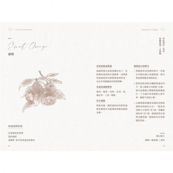 Chapter2療癒愛情的48種植物甜橙──和諧純粹的愛葡萄柚──跳躍喜悅的愛純正薰衣草──平衡穩定的愛香草──甜蜜依戀的愛山雞椒──奔馳璀璨的愛檸檬馬鞭草──回歸眞我的愛佛手柑──勇敢面對的愛檸檬──專注淸晰的愛茶樹──簡潔專一的愛甜馬鬱蘭──維繫幸福的愛玫瑰草──傾心相伴的愛橙花──溫柔呵護的愛玫瑰──珍重綻放的愛茉莉──柔軟自信的愛桂花──平衡適度的愛檀香──沉著穩健的愛銀冷杉──自在遼闊的愛黑雲杉──登高駐足的愛絲柏──疏通流動的愛香桃木(桃金孃)──揚帆再起的愛月桂──並肩支持的愛乳香──專注護持的愛玫瑰天竺葵──暖心歇息的愛快樂鼠尾草──幸福沉浸的愛羅馬洋甘菊──擁抱希望的愛樟腦迷迭香──透澈洞悉的愛維吉尼亞雪松──和諧心安的愛岩蘭草──滋潤扎根的愛甜茴香──溫潤散播的愛貞節樹──穩定守護的愛小豆蔻──永恆炙熱的愛肉桂──熱烈眞切的愛苦橙葉──舒心領略的愛黑胡椒──積極炙熱的愛綠薄荷──極簡舒適的愛生薑──滋養富足的愛肉豆蔻──風姿情挑的愛廣藿香──大地療癒的愛大根老鸛草──振奮修護的愛依蘭──魅惑歡愉的愛岩玫瑰──回溯重生的愛丁香──收斂止痛的愛沈香醇百里香──截然淨化的愛沒藥──覺醒無畏的愛歐白芷根──滋補灌溉的愛零陵香豆──緩心收攏的愛義大利永久花──刻骨銘心的愛纈草──永恆不變的愛