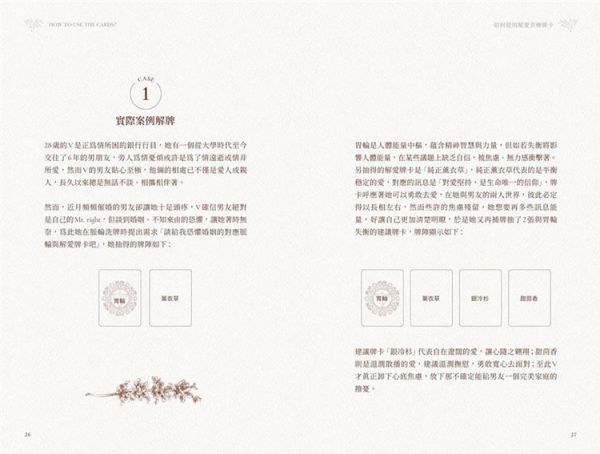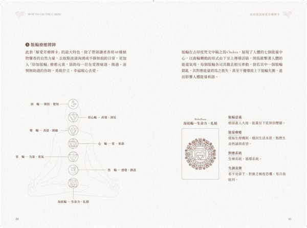 ︱解愛芳療牌卡使用說明︱ 「解愛芳療」將協助你透過牌卡覺察解析情愛的迷障,經由不同牌陣所透露的植物特質及文字剖析,用以深入探究情愛冰山下的眞實樣貌,結合阿育吠陀Ayurveda脈輪牌卡的自我檢測,找出混亂的主因,賦予你面對的勇氣與養分,伴隨你暖心自在擁愛前行。書中牌陣可運用於解答各種情感狀況,包含求愛、談愛、猶豫分手、關係停滯或卡關、斷聯…等,無所不問。