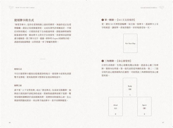 Chapter1如何使用解愛芳療牌卡前言使用牌卡的方式單一牌陣 ―【365天支持相伴】三角牌陣 ―【身心靈覺察】關係牌陣 ―【關係釐淸與建議】互動四方牌陣 ―【透析關係的盲點】脈輪療癒牌陣海底輪―生命力.扎根性輪―感受.創造胃輪―力量.勇氣心輪―愛.和諧喉輪―表達.圓融眉心輪―直覺.洞見頂輪―開悟.覺知脈輪牌卡搭配芳療牌卡的解愛使用【實際案例解牌1】【實際案例解牌2】【實際案例解牌3】