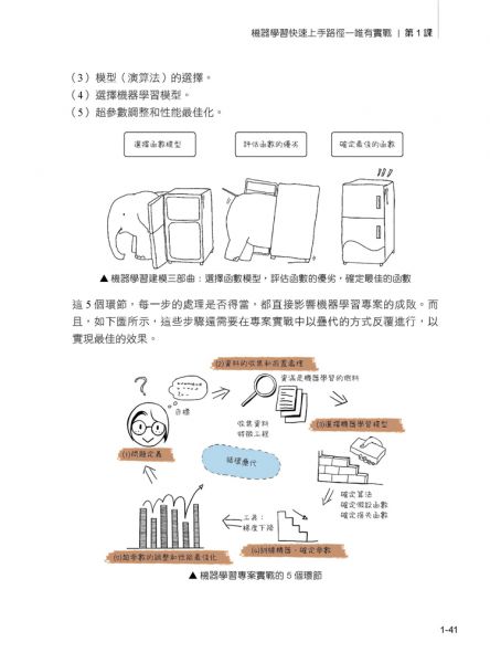 ▌實戰講解、深入淺出 ▌ 本書的「實戰案例」講解得都很細膩、透徹,期待本書把機器學習技術推入「尋常百姓家」。對於線性回歸、邏輯回歸和神經網路等內容循序漸進、層層深入的理論剖析,作者用靈活的方法詮釋深奧的理論,在內容深度上也拿捏合宜。此外,本書的整合學習和強化學習部分也很精彩,簡明扼要且重點突出,概念介紹特點鮮明。