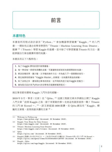 本書是利用Python參加機器學習競賽「kaggle」的入門書。一開始先以適合初學者學習的「Titanic:Machine Learning from Disater」競賽學習Kaggle的基礎。從中除了可學習實踐Titanic的方法,還能掌握自行參加競賽所需的知識。 本書特色 .為了kaggle撰寫的習作教學書籍 .每一章或每一節都有具體的主題,可讓讀者按部就班地掌握需要的知識 .解說各種表單、圖片檔、文字檔的操作方法,作為進入下一個競賽的路標。 .兩位執筆者都擁有「Kaggle Master」的稱號,也有賺到獎金的經驗 .除了說明之外,還有兩位筆者的對談,從不同的角度介紹Kaggle的魅力 .會為程式設計與Python的初學者詳細講解範例程式