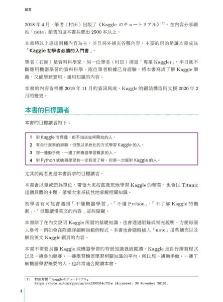 作者簡介 石原祥太郎(u++) .Kaggle Master(kaggle.com/sishihara)。 .2019年4月於「PetFinder.my Adoption Prediction」競賽獲得冠軍。 .2019年12月協助舉辦「Kaggle Days Tokyo」的競賽。 .於2019年3月在Qiita公開的Kaggle入門文章得到1600個讚。 .於日本經濟新聞社從事資料分析。