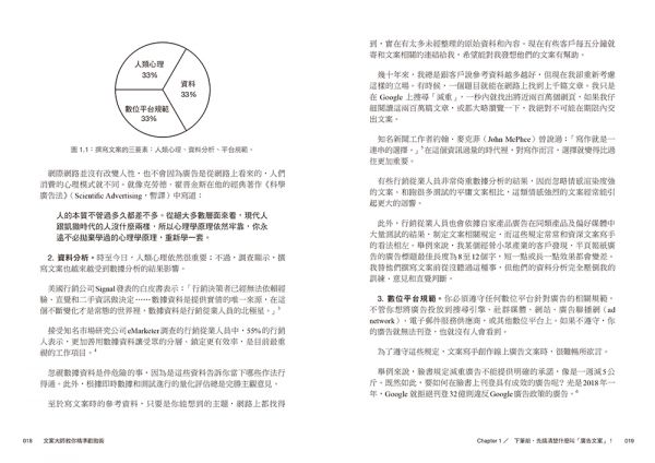 其中包括了我專門為第四版撰寫的新章節:第12章講登陸頁面、第14章討論網路廣告、第15章著墨社群媒體、第16章介紹影片腳本文案、第17章探討內容行銷,第18章則特別從案主角度切入,說明如何順利產出文案,包括如何找文案寫手、如何與寫手共事,以及審核文案等一系列流程。其他原本的章節內容也都經過修改,有些只有微調,有些則是大幅更新。其中,針對一些數位行銷策略的指導原則,包括網路影片、搜尋引擎最佳化、網路轉換、電子郵件行銷、線上廣告、社群媒體和內容行銷,我盡可能提供最新、最準確、最管用的資訊。