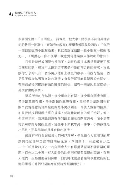 ◎ 這本書並非企圖要教讀者了解何為自閉症,也不聲稱代表自閉症家庭或更廣泛的自閉症經驗,它只是衷心訴說「愛孩子」的意涵,能夠提供照護自閉症孩子的家庭鼓舞的力量並了解其中的奮鬥及成果。