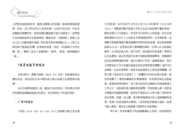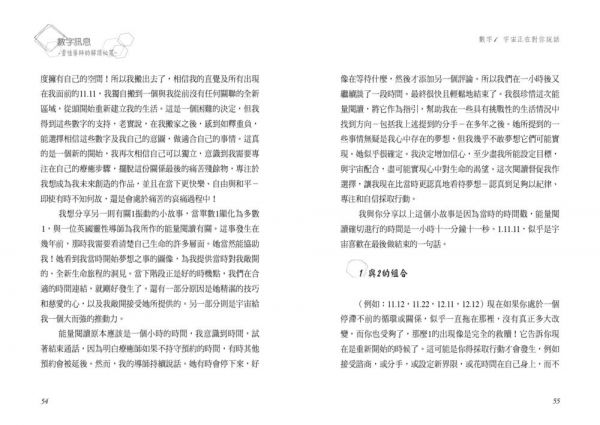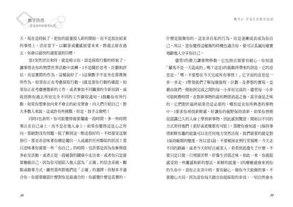 2. 實用的數字訊息:協助我們突破日常生活挑戰,例如:分手的療傷、搬家地點適合與否、夥伴關係陷入困境……等,書中分享許多作者如何在生活中運用數字訊息的實例。