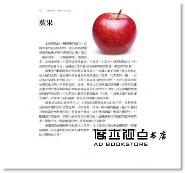 於是你知道,原來惡名昭彰的馬鈴薯裡裡外外都有價值,不僅有益健康,還能在你不知所措時給你力量與穩定感;蘋果的抗發炎特性使它成為對抗幾乎所有疾病的首選,並能在你感到沮喪、孤單、無力時提供撫慰;酪梨除了有助解決消化問題,並且是最接近母乳的食物,能夠像母親的愛一般滋養你;而生長於極端環境的野生藍莓,其實是在壓力中成長茁壯的專家,吃下野生藍莓,你就把「無論環境多艱難都能生存下來」的特質帶進身體裡。