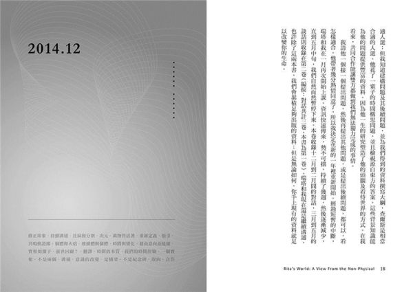 生命有意義嗎?我們對這個世界的重要性何在?有沒有什麼方法可以讓身處三次元的我們明確想像並了解非三次元世界?在對談中,瑞塔一一回答了這些問題,釐清人們常因語言或翻譯過程中遭誤導的資訊,並毫無保留地分享兼具三次元與非三次元世界的觀點,讓我們得以用全新的角度看待這個神奇的世界。