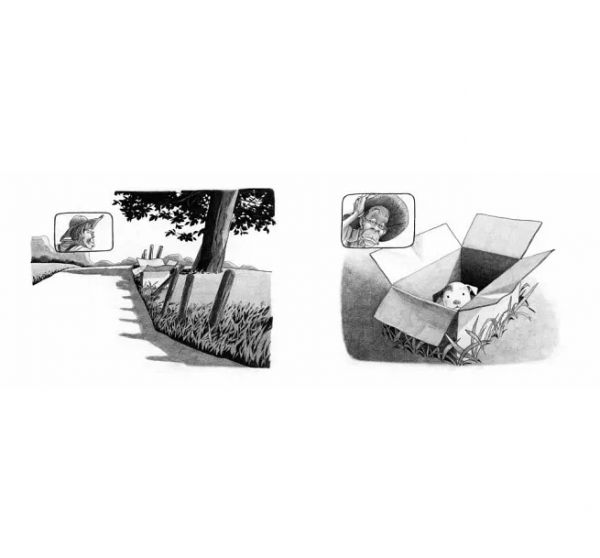 ▍《當天使飛過人間》無任何文字,一張張的黑白圖畫,或高或低、或遠或近、或橫或直,採「電影運鏡」與「漫畫分隔」手法呈現。一開頭灑著陽光、安靜的村莊裡,老農夫騎著腳踏車,發現被遺棄的小狗,起初沒有停下,但自己的小狗好奇回頭看,水花般噴濺的符號,暗示叫聲從身後傳來。農夫轉過頭,畫面聚焦在他驚訝的臉部表情,戲劇張力十足。隨後主角們高速飛翔時的大量留白,和濃密樹蔭下的浮光掠影,畫面在快節奏與沉思片刻之間穿梭,仍能環環相扣,節奏流暢,不斷拋出疑問和驚喜,是視覺敘事的極致發揮。