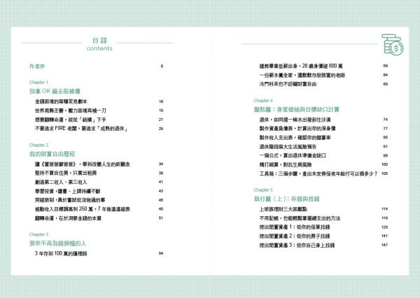 附錄:退休準備工具包(免費下載)收回 序作者序 最近幾年很多人喜歡談財富自由,提早退休。而大家現在看到我,可能會羨慕我已經達到這樣的狀態,但是有很多過程與細節,絕對不如大家想像。我跟先生在這一路的過程當中,有十分辛苦的一面,也有得此經歷 如獲人生至寶的體悟,而且這價值珍寶遠遠不僅是金錢而已。 我的先生退休時間比較早,40多歲。他在科技業工作了20 年,在43歲的時候得了糖尿病。會得糖尿病,很大一個主因是科技業工作壓力太大,飲食不正 常,加上長期壓力累積,他在2017年的時候突然之間一個月之內,體重從70 公斤掉到52 ~ 53公斤。因為體重下降很快,血糖又控制不好,工作壓力非常大的情況下,他在 2018 年得了憂鬱症。早上醒來躺在床上無力起床,完全無法下床走路,無法去上班。出乎意料的,我們是在這個背景下,被迫退休的。 我們確實很早就在規劃與實踐財富自由計畫,但這樣的「提早退休」劇情,絕不是我們原來計畫中的。所幸,在先生要離開職場的那一年,我們的被動收入實際上早就超過我們的年支出,所以在財務上,隨時離開都絕對沒問題。 回頭想想仍是捏把冷汗。這更應驗了我們早年就如此渴望擺脫金錢匱乏與選擇局限的束縛,並且努力為此目標去拚搏,完完全全就是對的決定,而且職場與生命,就是這麼血淋淋在向我們證明這點。 我是因為娘家的一場火災,決心要賺很多錢來擺脫對金錢匱乏的壓力,而選擇從原本的大學講師教職,轉而成為專職的主婦與投資學習者、執行者。而我先生則是在科技業工作到第 6 年的時候,便深切體悟到,這樣高壓又沒日沒夜的工作型態,對身心絕不是長久之計,一定要想辦法能早日跳脫這樣的老鼠賽跑輪迴。於是我們定下了第一個目標:被動收入大於年支出,在我們家,這個金額約為 125 萬元,結果我們花了 7 年時間達到了。 這個達標的過程當然並不輕鬆,我先生持續在高壓職場賣命工作,我則勇敢嘗試許多新的挑戰,期間也不乏經歷過許多黑暗與挫敗,只是當成功達到目標的時候,人生面貌與豐盛也以相互加成的方式回歸。7 年後的我,學會了投資,甚至成了作家,我們的財務結構從月薪族,轉型成有多重收入。 首度達到財富自由的時候,內在安定了一些,但我們其實並沒有在生活上做太大改變。我先生還是在科技業工作,繼續追求專業上的突破;我則繼續學習嘗試更多新的事物,而這效應也繼續以更大的複利方式暴漲,所以直到前面所說的先生被迫離開職場的時候,我們的「被動收入」早就遠遠超過原來目標的兩倍。 最近我常面對許多十分焦慮的人,覺得薪水不夠用,對工作職場厭倦,疫情與股市震盪更是雪上加霜,我寫這本書是想跟大家說,我也是從「焦慮」開始起心動念的。而我選擇面對這「焦慮」、對付「焦慮」,而我也鼓勵大家,想要擺脫困頓與限制,而萌生出「提早退休」的決心,絕對是跟焦慮正面對決、扭轉人生命運的最佳打擊位置。 我們一心想要提早退休,從來都不是不想要工作。我們提早退休,是想要自由。如今我們也真的感受到那個境界與滋味了。我跟先生其實都是很平凡的台灣囡仔,我們心思單純甚至很純樸,在這本書當中,如你即將讀到的,你會看到我們會焦慮、會脆弱,但我們也敢夢想、願吃苦、能努力。我們做到了,相信你也做得到。