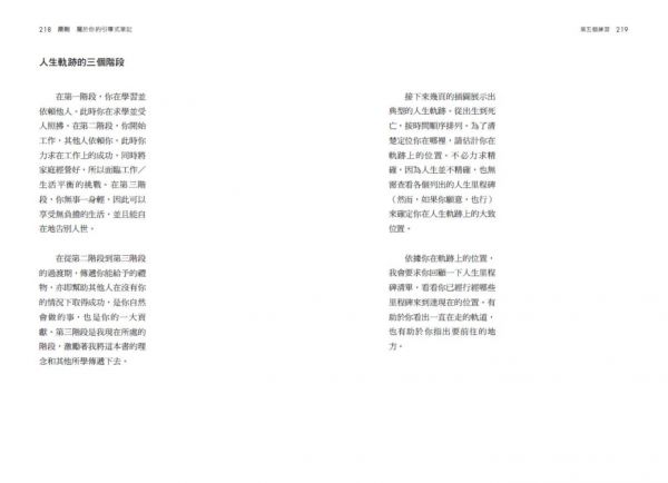 書中有一大亮點,是第五個練習「了解自己與所愛之人在人生旅程裡所處的位置」用了幾個半圓弧形的圖示,來呈現出我們一生旅程的每個里程碑,並且要求我們在每一個階段中,標出最重要的人,且記下他們的姓名頭一個字,查看我們和至愛之人可能會出現的里程碑,幫助我們想像十年後會在哪裡發生哪些事。這是我從未見過的獨到方法與見解,真的令人眼睛為之一亮!