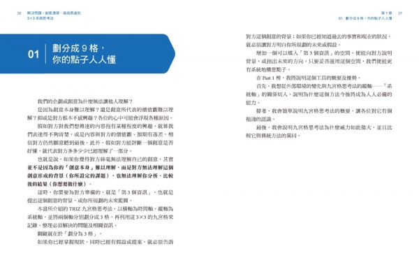 「在講述管理課程的觀念時,我會帶著大家垂直思考,但是談到案例的運用變化,又必須用到水平思考。正當思維的轉換令我困擾時,看到書中來自蘇聯解密的『TRIZ九宮格思考法』,可以同時『垂直且水平』的3×3思考,頓時有種相見恨晚的感覺。」——李河泉,知名百大企業顧問、「新世代領導」千萬首席講師、商周CEO學院課程王牌引導教練、台積電「跨世代溝通」共創課程指定講師