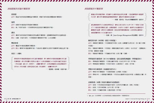 在飲品與酒的款式已越來越豐富的今天,可能出現的搭配變化更是以倍數的速度在增加。要找到恰當的搭配,除了要自己多試,更重要的是,去參考前人在搭配時的思考迴路,例如:氣泡可以減輕餐食的豐厚口感;美乃滋或番茄醬要搭配稍有甜度的葡萄酒,以免飲品被醬料的甜味蓋過;又酸又甜又辣的東南亞料理,可以搭配偏甜、低酸度的酒,因為酸味會把辣味激發出來——除非你特別喜歡吃辣。書中的這些搭配邏輯,在你喝到新飲品時,將會提供一些靈感線索,之後,你就能發明出自己喜歡的組合了。