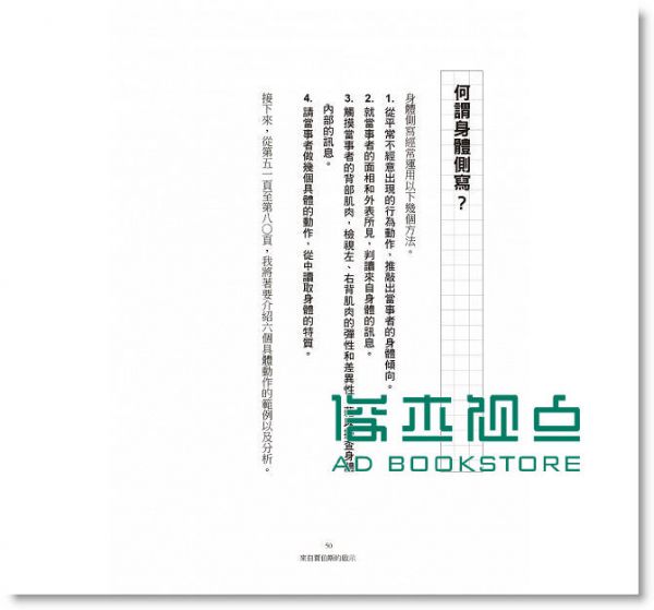 6測驗,人人都能輕易讀懂自己與別人利用「雙手十指交握時哪隻大拇指在上」測驗,看出你下決定的速度;利用「雙手抱胸時,哪隻手臂在上」測驗,看出你的思考模式;利用「翹腳時,哪隻腳在上」,看出你的目前的心態;利用「眼珠子容易往哪邊轉動」,看出你的疲勞模式;利用從「呼吸的順暢度」,看出你該如何發揮能力;利用「身體的傾斜習慣」,看出適合你的飲食方式。就算沒學過心理學、沒修過行為分析,你也能擁有一雙火眼金星,一眼看懂自己和別人的身體語言。
