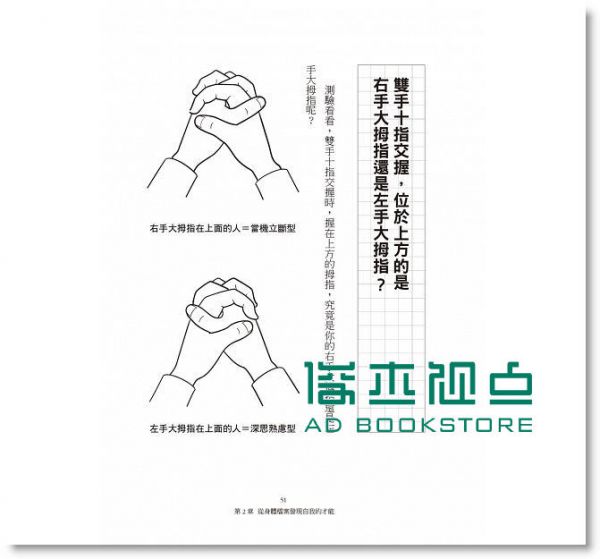 從慣性動作找對方揮方向,必能成為職場潛力股!●除了透過20年實務經驗,將2萬2000件案例統整歸納分析之外,作者更進一步將「十指交握」和「雙手抱胸」的結果,做了排列組合,得出四種結果,並深入分析其長處、弱點、身體特質及該發揮的方向。讀者們不妨看看自己是哪一種類型,找出自己在職場上的合適定位,晉升職場潛力股一員!●此外,作者更特別點出不同類型的人,身體運作時比較賣力、承受相對大壓力的臟器不同,作者認為每種臟器都有其功能,而這種功能恰恰好就是你潛在性格特質的反射。為此,作者也大篇幅介紹了各臟器的特質與功能性,並告訴我們應該好好掌握那些突出臟器的功能,學會善用它們,達到截長補短的目的。