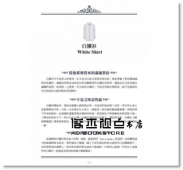 女人的衣櫃,一定有一件經典單品 經過時間考驗的單品 變成永不退流行經典款 長T、A字裙、牛角扣外套、水餃包…… 隨意穿搭,就是吸引人的目光 白襯衫,瀟灑中帶點性感 九分褲,簡單俐落又百搭 印花長裙,穿出一身嫵媚 細高跟鞋,增添婀娜姿態 101款超越時間的經典單品