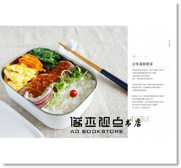 作者序 慣用的調味料在地調味品異國調味品 愛用的廚房好物 從煮飯說起蒸爐蒸煮瓦斯直火鍋煮電子鍋其他雜糧的添加 料理前的二三事好好洗手好好洗菜好好採買 ◎因為愛,所以親手做便當。--便當篇‧翼板牛肉片佐蔥鹽醬便當‧五味透抽便當‧豆豉風味虱目魚燒便當‧蒜香蝦仁便當‧蝦仁炒蛋便當‧醬燒小卷便當‧QQ布丁肉便當‧皮蛋炒雲耳肉末便當‧油鹽烤肉豆蔻風味豬邊肉便當‧薑燒豬五花便當‧醬烤豬肋排便當‧蔥燒豆豉雞丁便當‧三杯牛肋便當‧元氣黑咖哩牛肉便當‧玉米蒸肉便當‧肉末馬鈴薯便當‧即食咖哩肉醬便當‧松子蒜香雞便當‧油烤百里香薄鹽鯖魚便當‧青椒牛肉黃金炒飯便當‧南瓜野菇炊飯便當‧洋風燉牛肋便當‧香栗燒雞便當‧香煎白帶魚便當‧宮保雞丁便當‧時令蓮藕燉肉便當‧泰式風味春雨肉末便當‧泰式辣炒雞丁便當‧番茄燉肉便當‧紫蘇風味蝦便當‧嫩烤豬邊肉便當‧蒜味鹽麴燒肉便當‧樹子蒸雞便當‧燒烤香草肉片便當‧醬烤牛肋便當‧雙色蘿蔔炊飯便當‧颱風過後的蘿蔔乾蛋炒飯便當‧薑絲肝連便當‧白菜滷肉燥便當‧白玉蘿蔔燉肉便當 ◎因為愛,所以親手做便當。--主菜篇‧翼板牛肉片佐蔥鹽油醬‧五味透抽‧豆豉風味虱目魚燒‧蒜香蝦仁‧QQ布丁肉‧皮蛋炒雲耳肉末‧爐烤肉豆蔻風味豬邊肉‧薑燒豬五花‧醬燒小卷‧蝦仁炒蛋‧醬烤豬肋排‧蔥燒豆豉雞丁‧三杯牛肋‧元氣黑咖哩牛肉‧玉米蒸肉‧白灼嘴邊肉佐家製腐乳芝麻醬‧肉末馬鈴薯‧即食咖哩肉醬‧松子蒜香雞‧青椒牛肉黃金炒飯‧南瓜野菇炊飯‧洋風燉牛肋‧香栗燒雞‧香煎帶魚‧時令蓮藕燉肉‧泰式風味春雨肉末‧番茄燉肉‧泰式辣炒雞丁‧紫蘇風味蝦‧蒜香鹽麴燒肉片‧樹子蒸雞‧燒烤香草肉片‧醬烤牛肋‧雙色蘿蔔炊飯‧蘿蔔乾蛋炒飯‧油烤百里香薄鹽鯖魚‧宮保雞丁‧嫩烤豬邊肉佐香菜洋蔥青檸醬‧白菜滷肉燥‧薑絲肝連‧白玉蘿蔔燉肉 ◎因為愛,所以親手做便當。--副菜篇‧玉子燒&骰子厚蛋燒‧豆豉山苦瓜‧金平牛蒡‧紅蘿蔔炒蛋‧荷包蛋‧焦糖四季豆‧Q潤水煮蛋‧酒香牛蒡‧黑芝麻拌菠菜‧菜脯蛋‧蒜香紅蘿蔔‧糖醋藕片‧蝦皮四季豆‧蝦皮栗南瓜‧鵝油蔥拌水煮菠菜‧三色甜豆‧水煮秋葵‧水煮鮮筍‧四季豆蛋沙拉‧豆芽彩椒拌油蔥‧酒香四季豆‧豆豉糯米椒‧油鹽烤白花椰‧金黃薯泥菓子‧茄汁甜不辣‧韭菜花炒雞蛋鬆‧酒香鯷魚綠花椰‧蒜香雲耳茭白筍‧涼拌紫茄佐魚露辛香醬‧番茄炒蛋‧滑嫩雞蛋鬆‧蔥仔煎蛋‧錦絲玉子‧菠菜蛋捲‧薑炒彩椒娃娃菜‧蒜香青檸鮮菇‧原味鮮菇‧蒜炒青菜系列 ※蒜炒綠花椰 ※蒜炒有機油菜花 ※蒜炒荷菜小白菜 ※蒜炒青花筍 ※蒜炒豌豆苗 ※蒜炒紅莧菜 ※蒜炒龍鬚菜 ※蒜炒茭白筍‧紫蘇風味涼拌洋蔥佐柚碰醋‧蒜香莧菜‧金平蓮藕‧醋溜馬鈴薯絲‧櫻桃蘿蔔漬‧南洋風辣炒四季豆‧蒜炒蘆筍‧秋葵與海藻沙拉‧鴻喜菇炒高麗菜‧新鮮櫻花蝦炒高麗菜‧洋蔥炒蛋‧黑芝麻風味杏鮑菇‧乾炒香蒜蘑菇‧薑絲大同‧薑絲炒皇宮菜‧櫻花蝦炒絲瓜‧薑炒絲瓜‧金平紅蘿蔔‧蝦皮蒲瓜 後記:乾淨的廚房收回 序