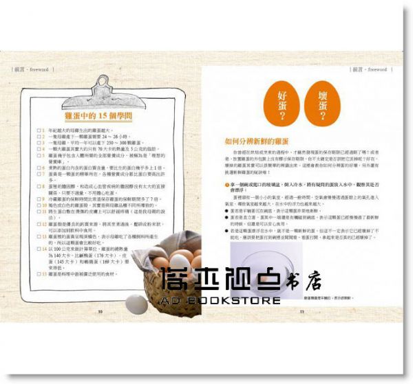前言雞蛋中的15個學問好蛋?壞蛋? Chapter1 全蛋煮法Way to cook an egg全熟水煮蛋Hard Boiled Egg 半熟水煮蛋Soft Boiled Egg法式水煮蛋A La Coque 低溫烹調水煮蛋Sous Vide Egg 溏心蛋Ramen Soft Boiled Egg 水波蛋Poached Egg 袋子裡的水波蛋 Idiot Proof Poached Egg 太陽蛋Sunny Side Up Eggs荷包蛋Chinese Style Sunny Side Up Eggs咖啡機蒸氣蛋Cappuccino Eggs 茶碗蒸Chawanmushi Japanese Steamed Eggs 炒嫩蛋Scrambled Eggs