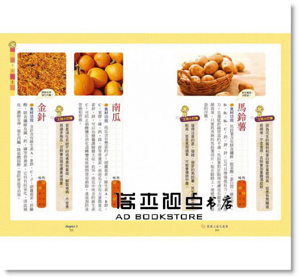 Chapter3 五行娃娃教你吃出健康【跟著金娃吃蔬果】白蘿蔔/腰果/白木耳/蘑菇/金針菇/菱角/筊白筍/白花椰菜/大蒜/大白菜/杏鮑菇/洋菇/牛蒡/杏仁/苦瓜/洋蔥【跟著木娃吃蔬果】蘆筍/空心菜/豌豆/綠豆/萵苣/小黃瓜/菠菜/絲瓜/高麗菜/韭菜/蔥/青椒/花椰菜/青江菜/芹菜/地瓜葉/冬瓜/茼蒿/釋迦/檸檬/椰子/棗子/香瓜/芭樂/香菜/四季豆/奇異果【跟著水娃吃蔬果】黑芝麻/黑豆/黑木耳/海帶/香菇/芋頭/黑李/烏梅/小藍莓/葡萄/蔓越莓/茄子【跟著火娃吃蔬果】胡蘿蔔/辣椒/紫蘇/紅鳳菜/紅豆/櫻桃/蘋果/蓮霧/楊梅/番茄/草莓/荔枝/紅柿/百香果/石榴/火龍果/西瓜/山楂【跟著土娃吃蔬果】糙米/黃豆/蓮藕/蓮子/花生/馬鈴薯/南瓜/金針/竹筍/地瓜/薑/玉米/龍眼/鳳梨/木瓜/楊桃/栗子/柑橘/枇杷/芒果/葡萄柚/香蕉/山藥/水梨