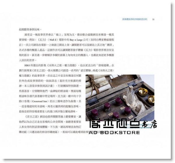 然而,從本書裡的訪談段落裡,也可一窺知名創意人的製作心得,有的作品來自紅極一時的獨立電影《厄夜叢林》(The Blair Witch Project)、MTV電視台的沉浸式影集《維蒙小鎮》(Valemont),還有電影《黑暗騎士》(The Dark Knight)的得獎行銷作品“Why So Serious?”。這些創作人帶給我非常豐富的創作啟發,而我也希望他們也能啟發你一些創作靈感。