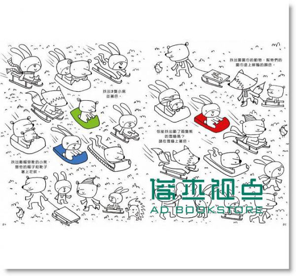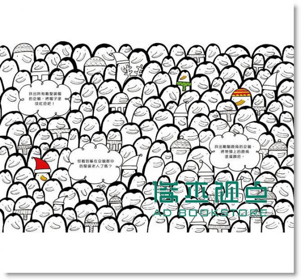 《你來找,我來畫》專為3歲以上的孩子設計的填色遊戲書,每一個豐富的頁面,都會附上簡單的提示,「哪輛車上載有兩隻雪人?」、「聖誕老公公該滑下哪根煙囪,才能成功送達禮物?」、「聖誕樹躲在冰山的哪邊?」、「哪頭麋鹿有著獨特的斑點?」