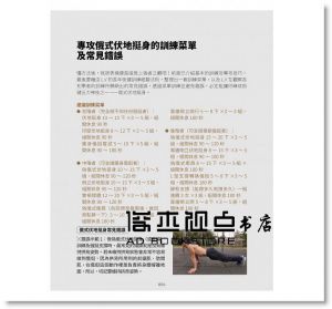 本書主要內容為「街頭健身五大神技」,包含人體國旗、暴力上槓、前水平、後水平、俄挺,每個動作皆有步驟示範圖,對照能練到的身體肌群,幫助讀者充分評估自身肌力,依照不同難易度的訓練菜單及課表完成自我鍛鍊。