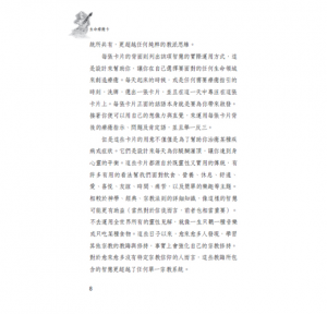 但是這些卡片的用意不僅僅是為了幫助你治癒某種疾病或症狀。它們是設計來每天為你醍醐灌頂,讓你達到身心靈的平衡。這些卡片都源自於既靈性又實用的傳統,有許多有用的看法幫我們面對飲食、營養、休息、舒適、愛、喜悅、友誼、時間、痛苦、以及簡單的樂趣等主題。相較於神學、經典、宗教法則的詳細知識,像這樣的智慧可能更有助益(當然對於信徒而言,前者也相當重要。)不去運用全世界所有的靈性見解,就像一生只聽一種音樂或只吃某種食物。這些日子以來,越來越多人發現到,學習其他宗教的教誨與修持事實上會強化自己的宗教修持。對於越來越多沒有特定宗教信仰的人而言,這些教誨所包含的智慧更超越了任何單一宗教系統。