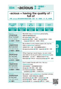只要單字裡面出現書中收錄的「字首、字根、字尾」,就有不同的意思或是功用,幫助你更快理解單字意義及背誦!